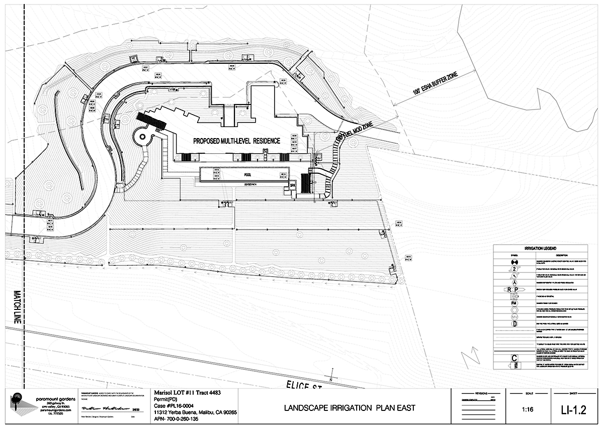 This frame is an irrigation plan for the same residence in Malibu on a previous page. We designed irrigation for fifteen 2 acre lots and all the common grounds for this project.
