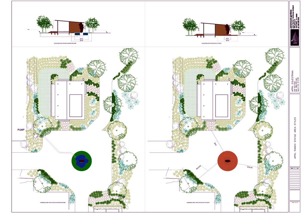 A a design study for placement and height for an original Nic Fiddian-Green sculpture that will be placed in the center of the parking court at the ranch in Calabasas . The two studies show one concept with the horse head in water , the other on a low plinth . The elevation is to show the scale relationship of the piece in front of the main club house. |