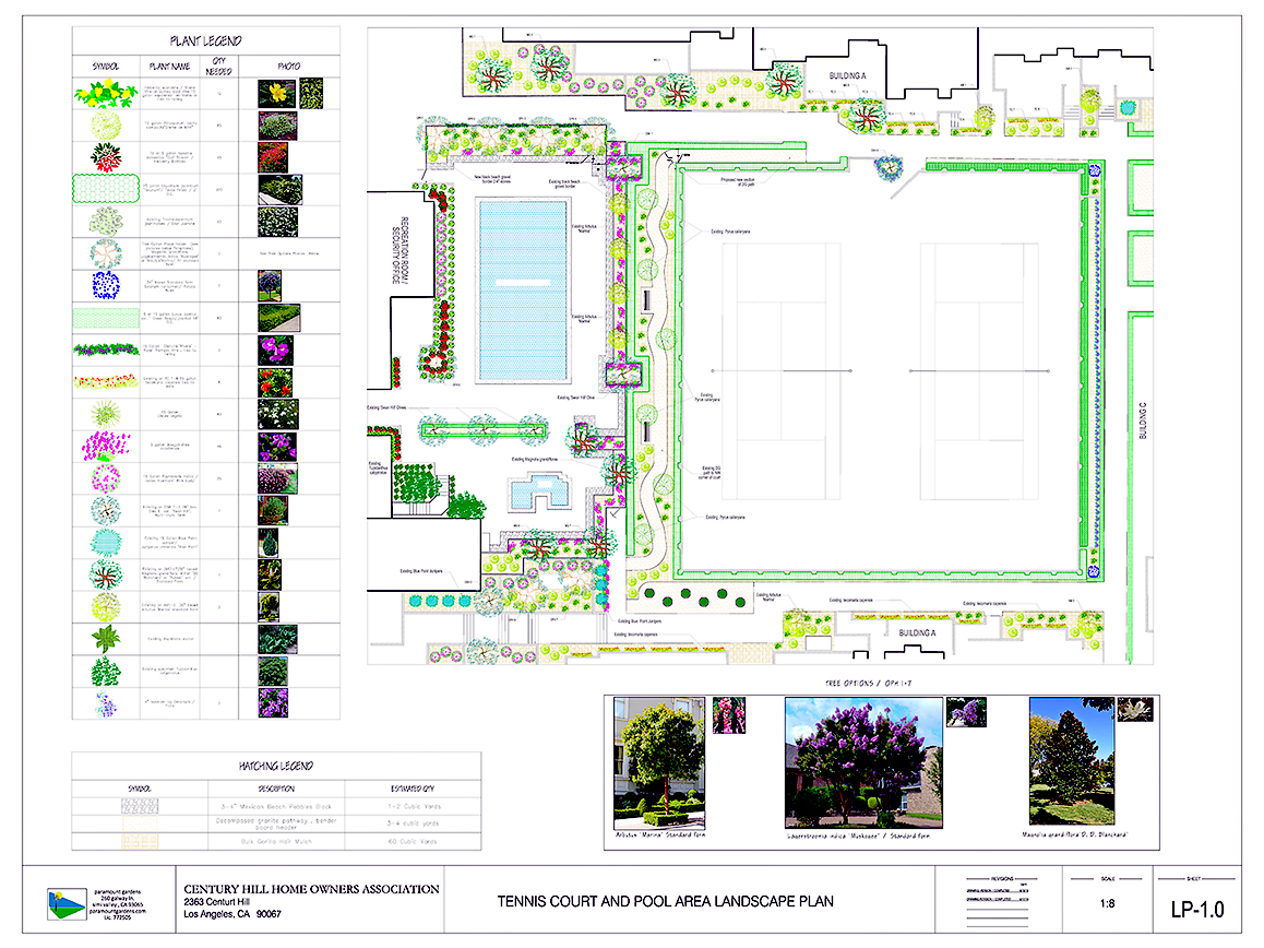 A landscape design for a condominium complex in Century City, CA. This client is having to change the majority of the landscape, section by section, to facilitate re-waterproofing the sub-strcture over the parking garage beneath. This plan helps how the resident based Landscape Committee, with photos, the different plant and tree types suggested for the planters so they have a better idea of tecture and color of plant material. |