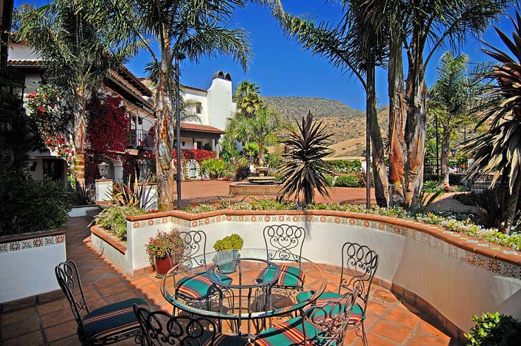 The design concept is a classic Spanish style courtyard with lots of Bougainvillea on white plastered walls and an authentic courtyard fountain.