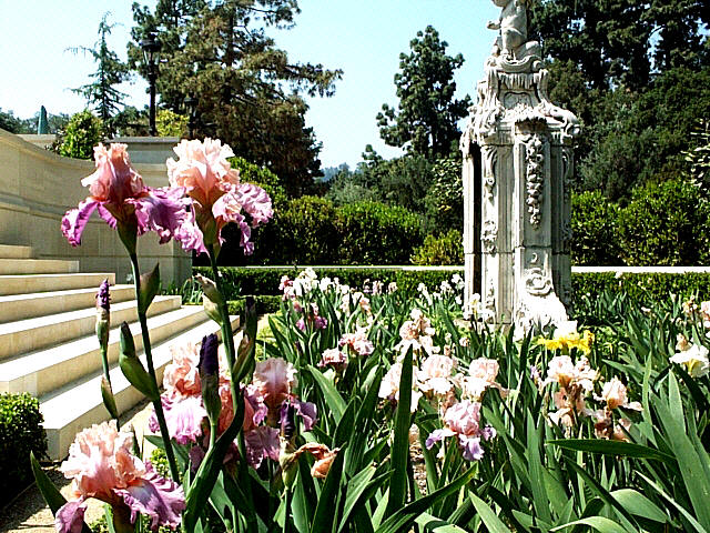 A close up view of the bearded iris in the lower part of this terrace garden. These iris are available at Greenwood Gardens.