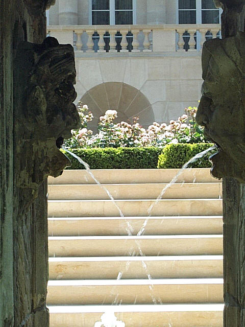 A view through the cherub fountain in the terrace garden , showing off the elegant stair case. The fountain was imported from France by ship and is over 100 years old.