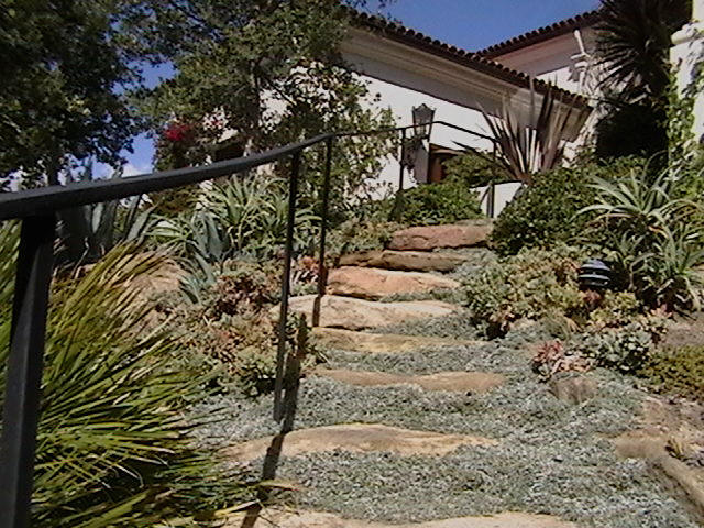 These stairs were made with natural rock from the same site . The ground cover is Dymondia margaretae, click the link to see a close up photo